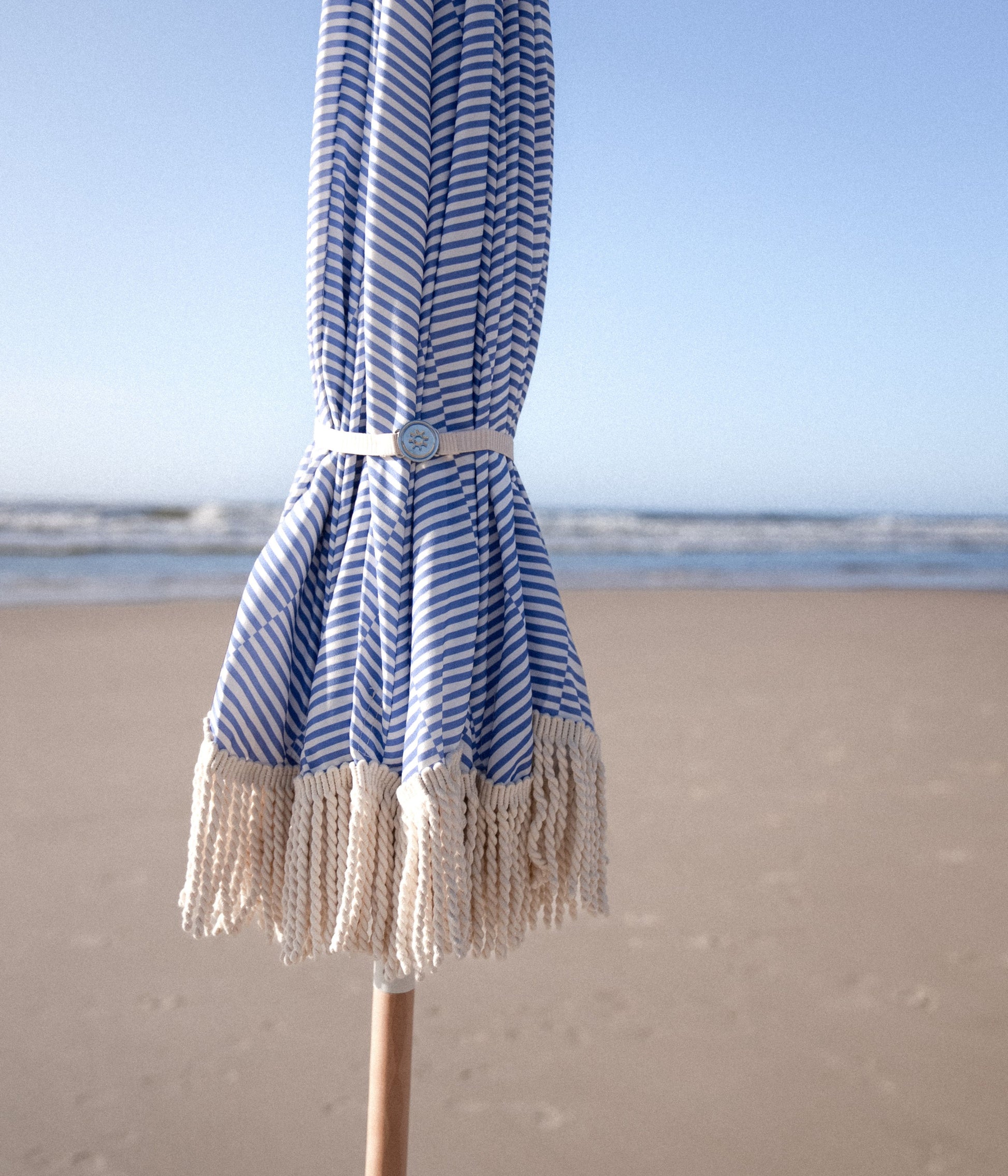 Our timeless beach umbrella with premium finishes and UPF50+ fabric. Designed for long sunny days in our Pacific Stripe signature print. Made with RPET (recycled) Premium Fabric.