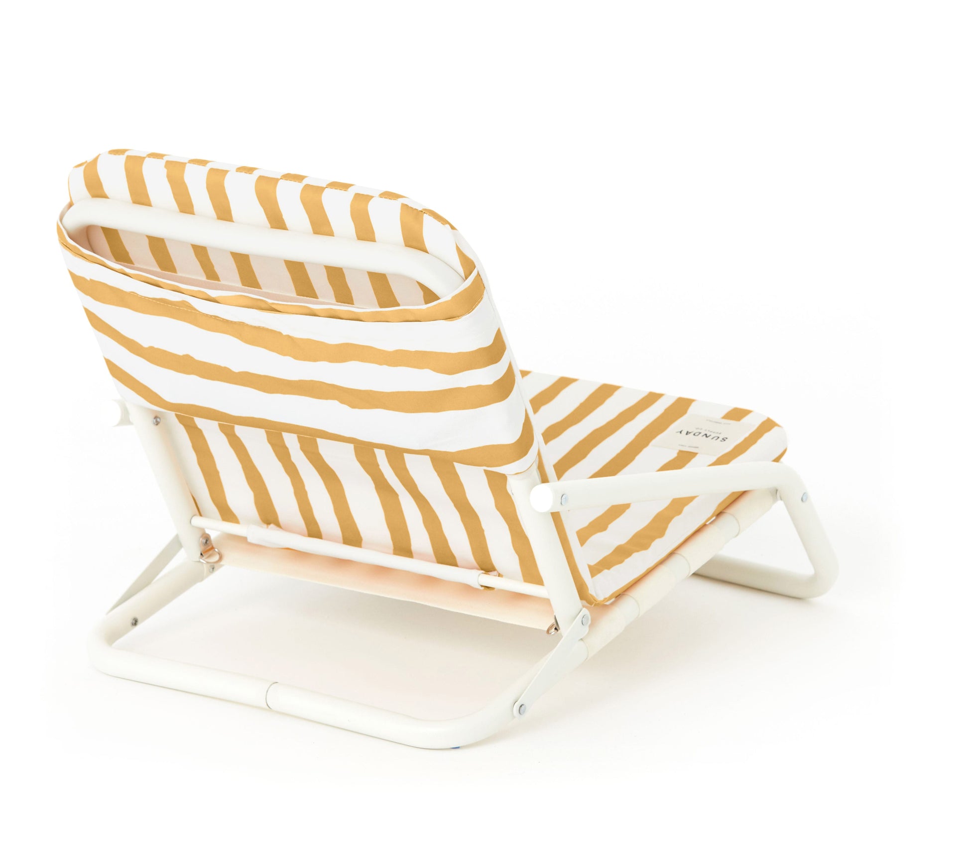 Our Beach Chair is low profile and fixed recline at 18cm from the ground.