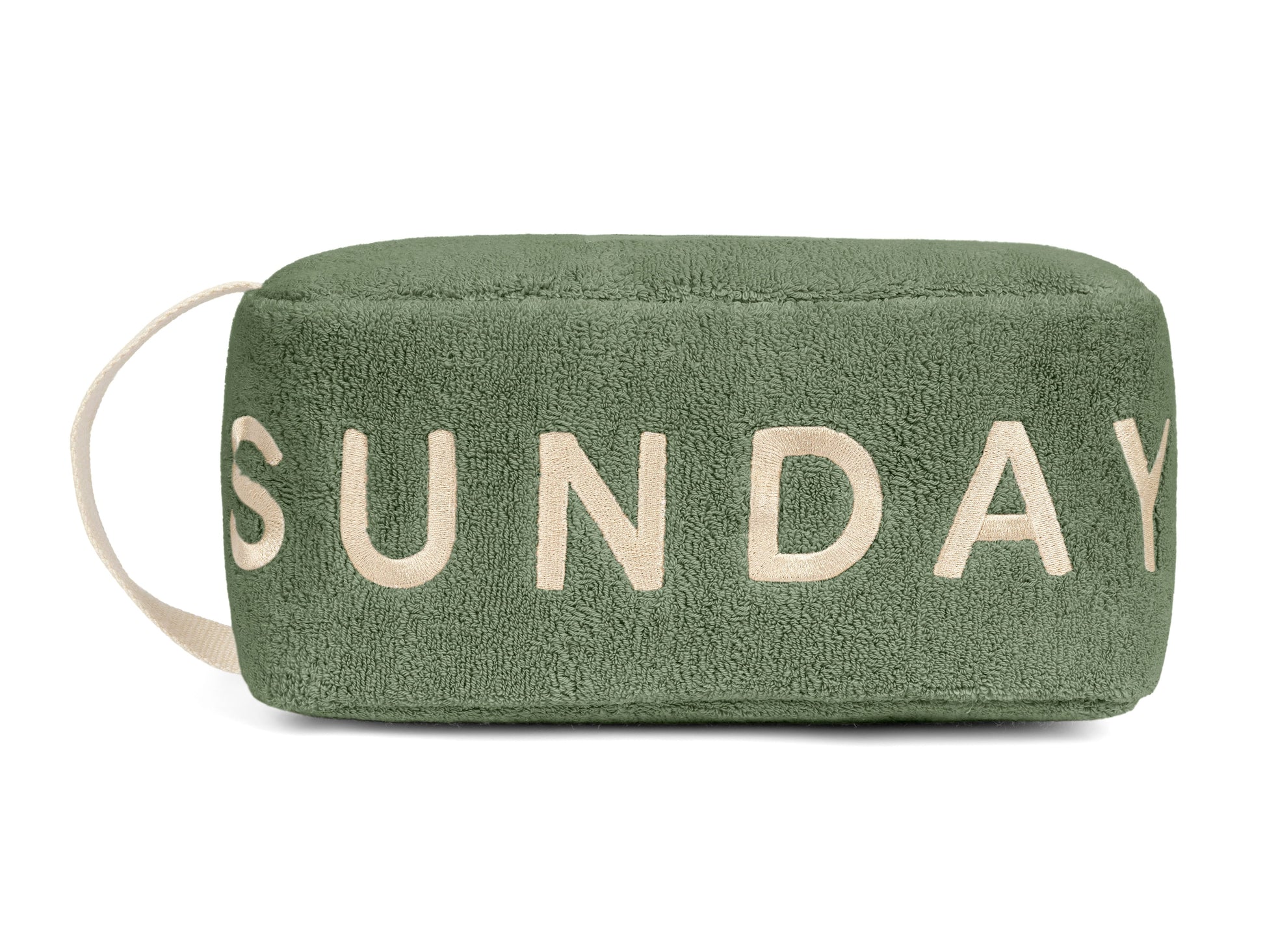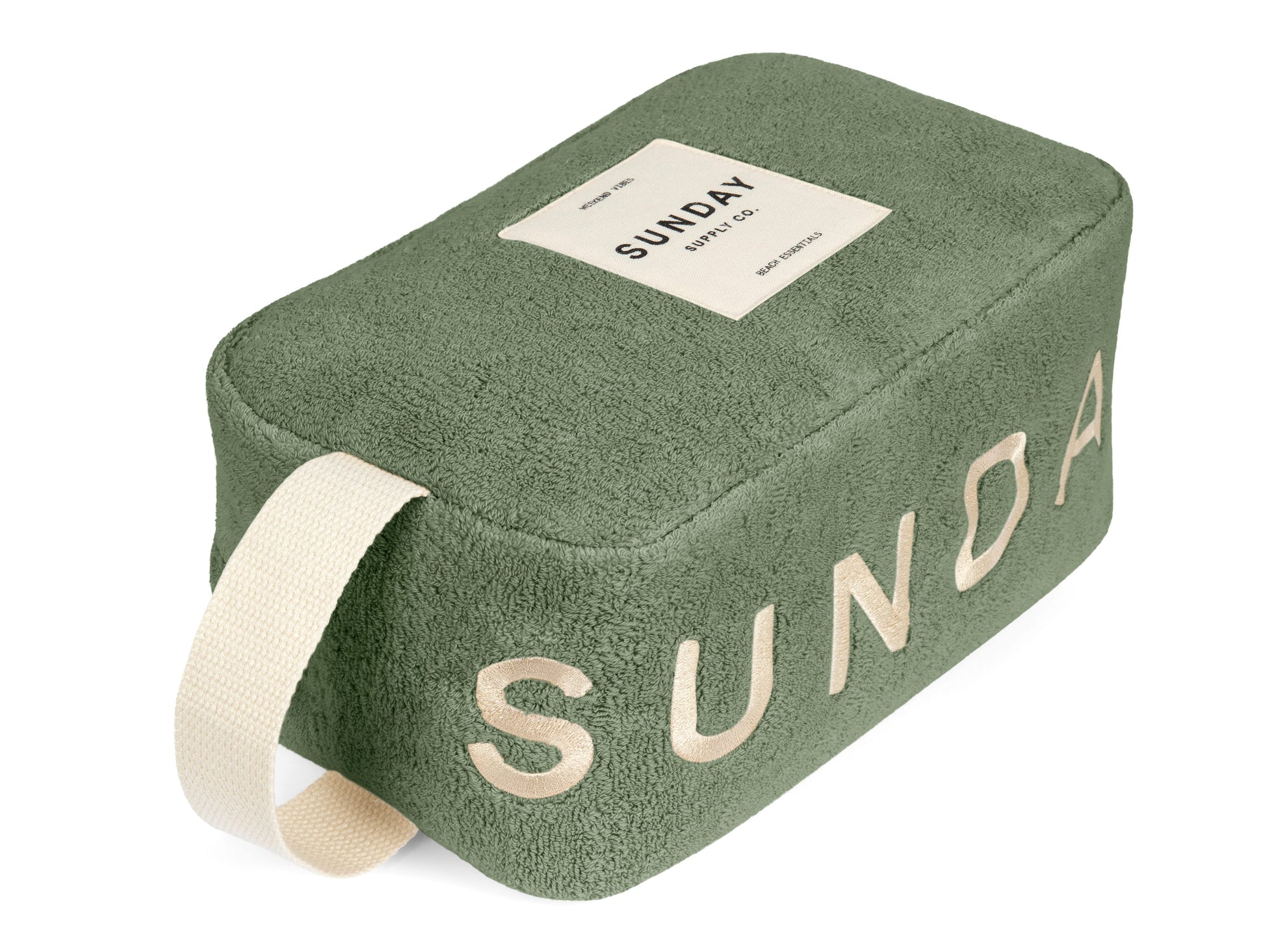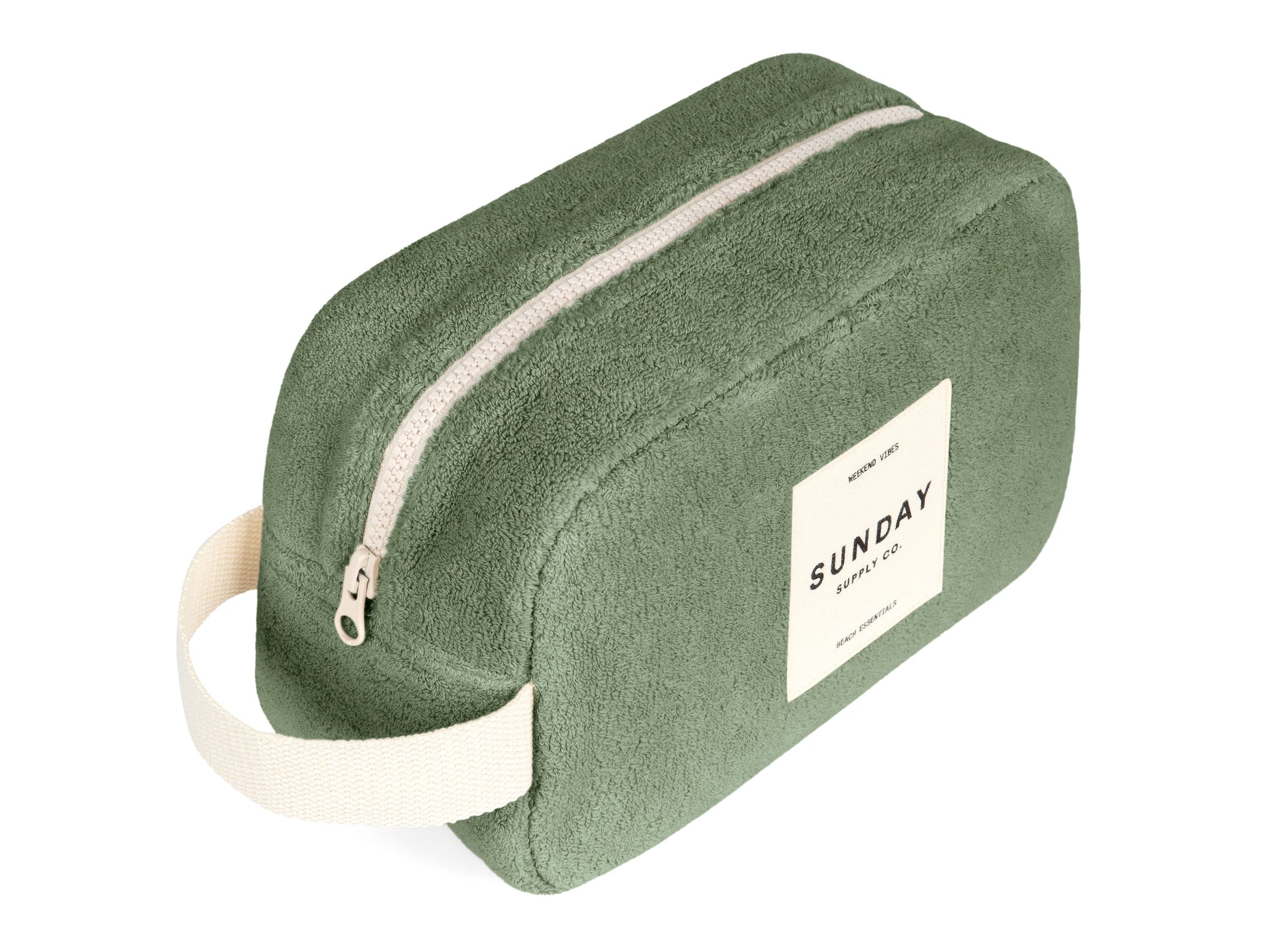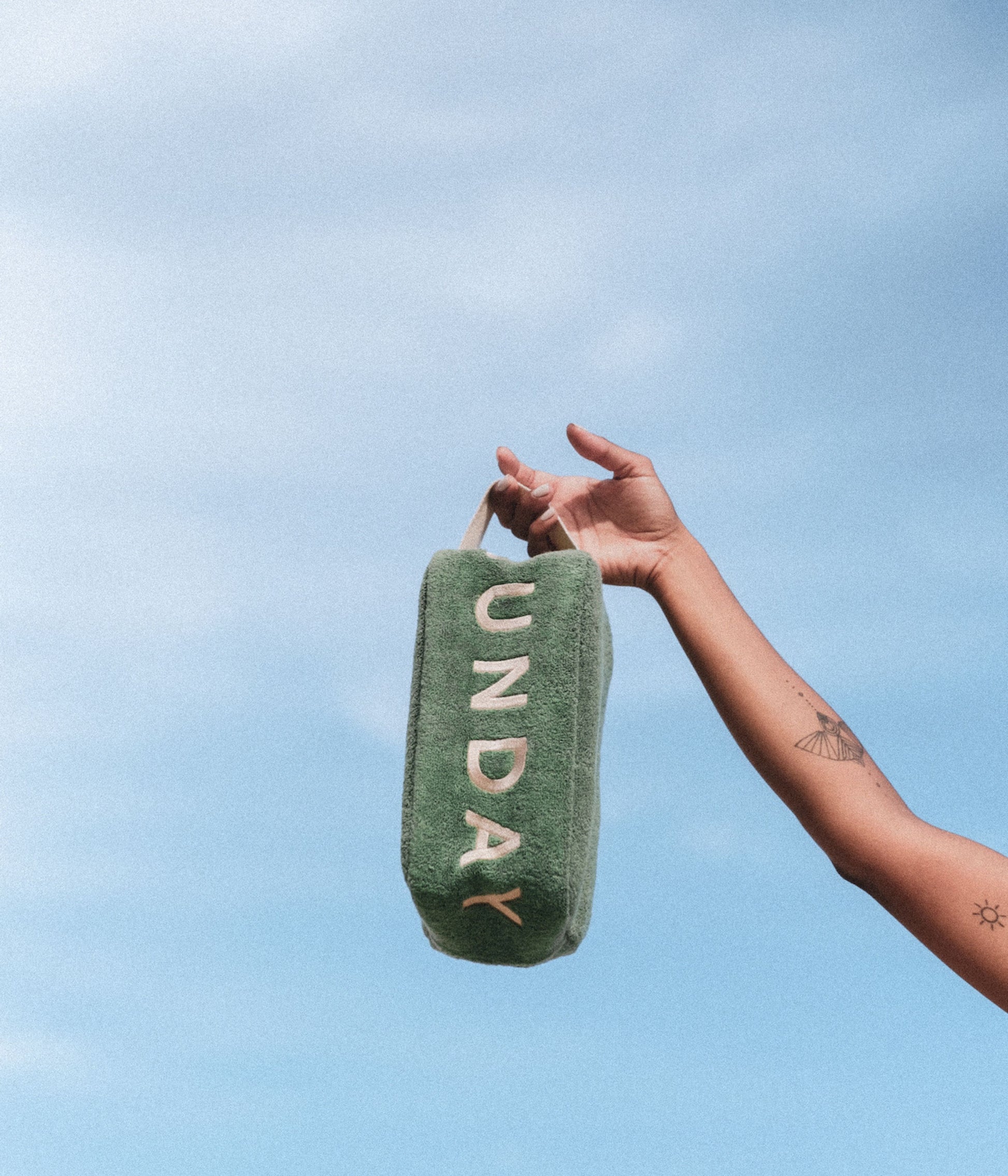 Featuring a 100% terry towelling outer, lined with heavy duty cotton canvas and zipped with premium YKK zip hardware. A thick canvas handle is attached to a single side of the pouch and our signature ‘SUNDAY’ patch logo is featured on the front with our embroidery on the bottom.